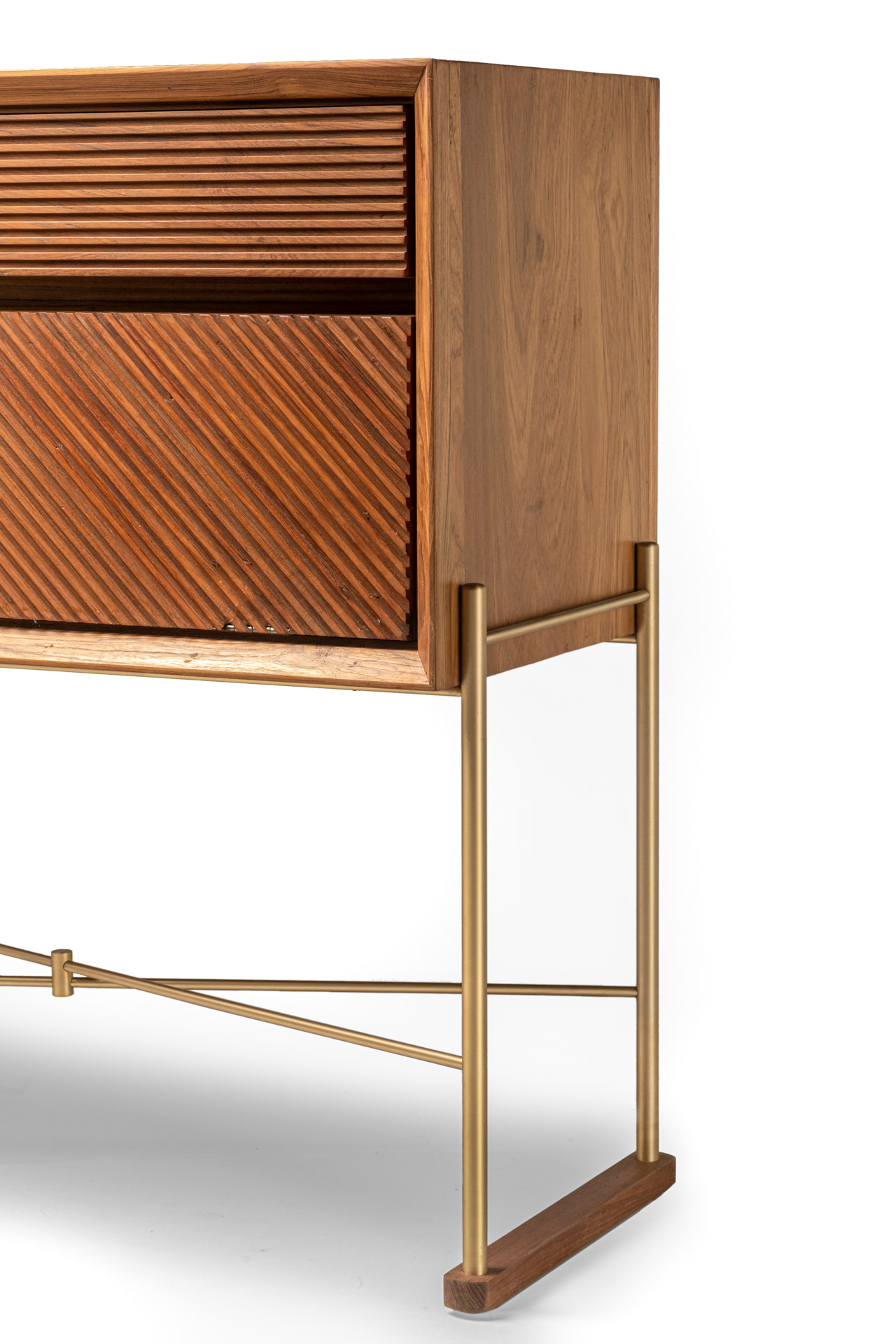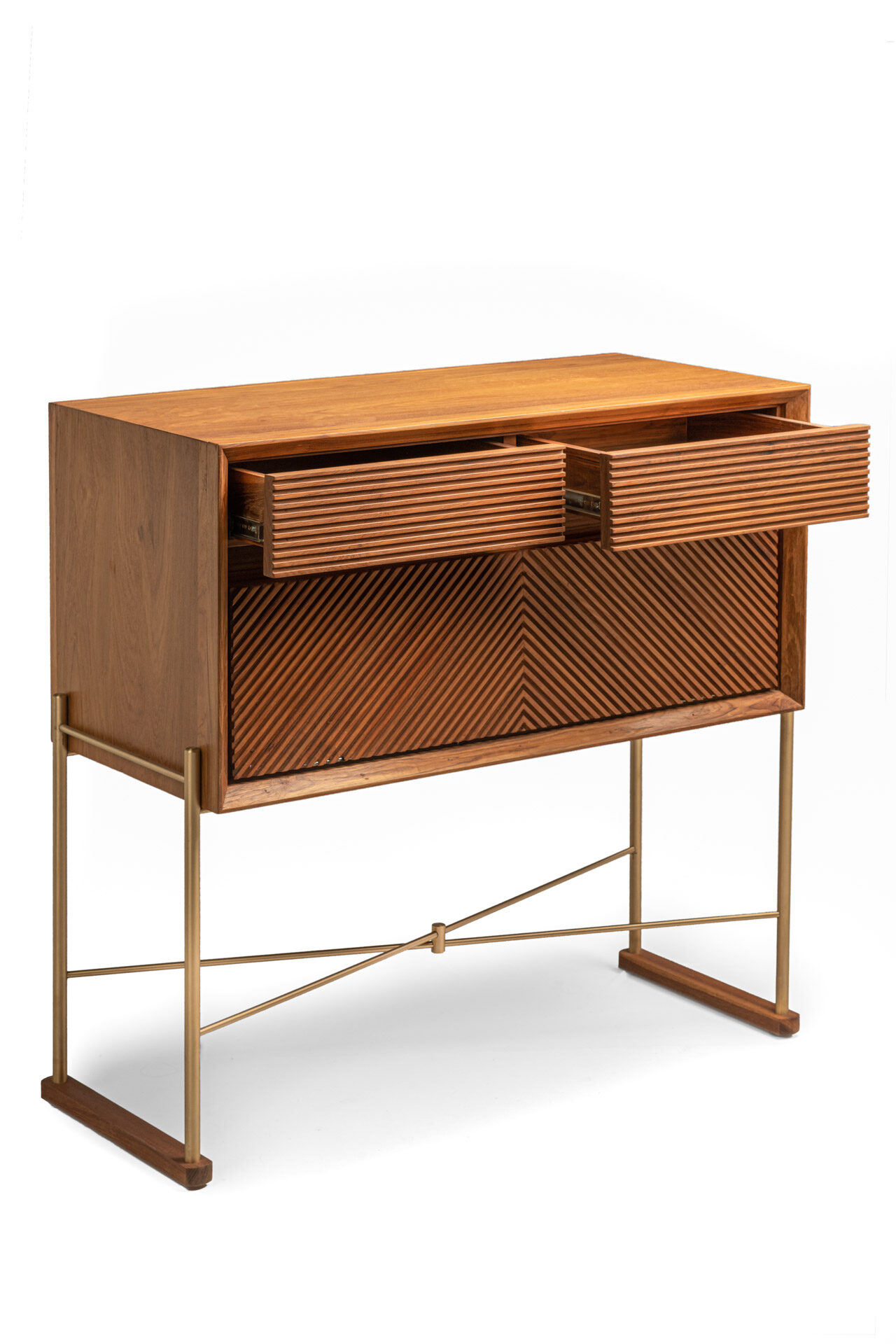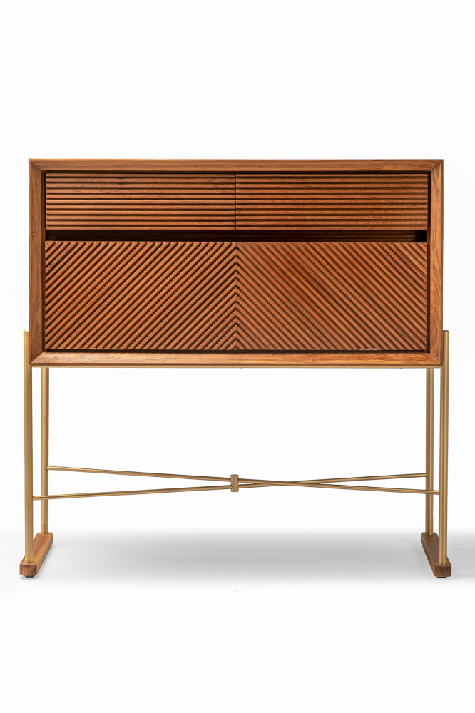 Inspired by geometry, the Raw Console features drawer facings that highlight clean linearity. Its bold brass framework pairs seamlessly with fine teak detailing, striking a perfect balance between artistry and function.