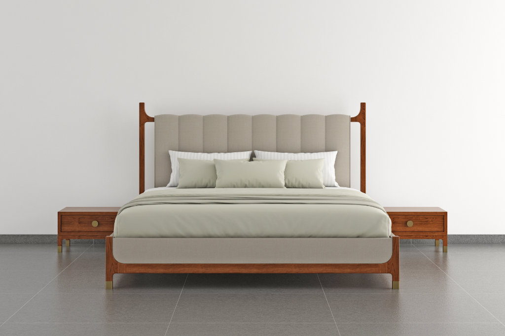 The Vyne Bed is a seamless blend of grace and craftsmanship — where classic elegance meets modern form. Its sculpted teak frame accentuates the soft, channeled upholstery, creating a refined silhouette that feels both grounded and inviting. Brass-capped legs add a touch of quiet luxury, while the gentle contours of the headboard offer comfort and sophistication. A timeless piece designed to bring warmth, poise, and enduring style to any bedroom.