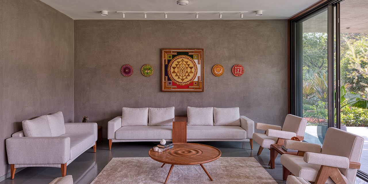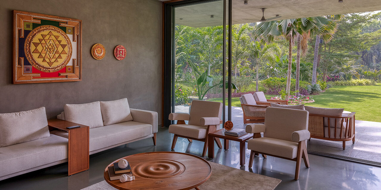 Crafted in natural wood and earthy tones, the furniture grounds the light-filled interiors while echoing the architectural language of softness and flow. From the inviting lounge seating to the handcrafted dining ensemble set against the striking red concrete wall, every element is designed to foster comfort, connection, and timeless elegance—becoming an integral part of the home’s calm, organic rhythm.