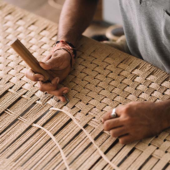 Where designs call for texture, our artisans weave cane, rope, or natural fibres into teakwood frames. The weaving adds lightness and tactility, creating a dialogue between solidity and softness that enriches each design.